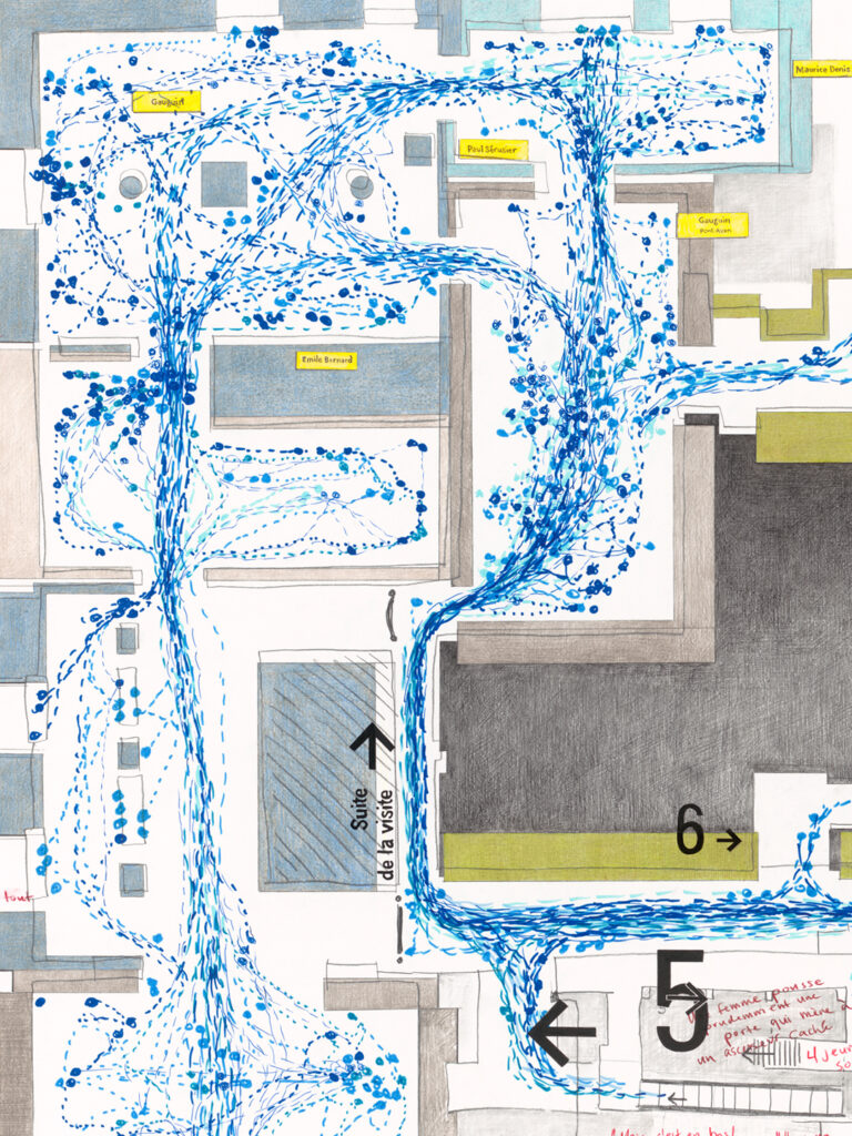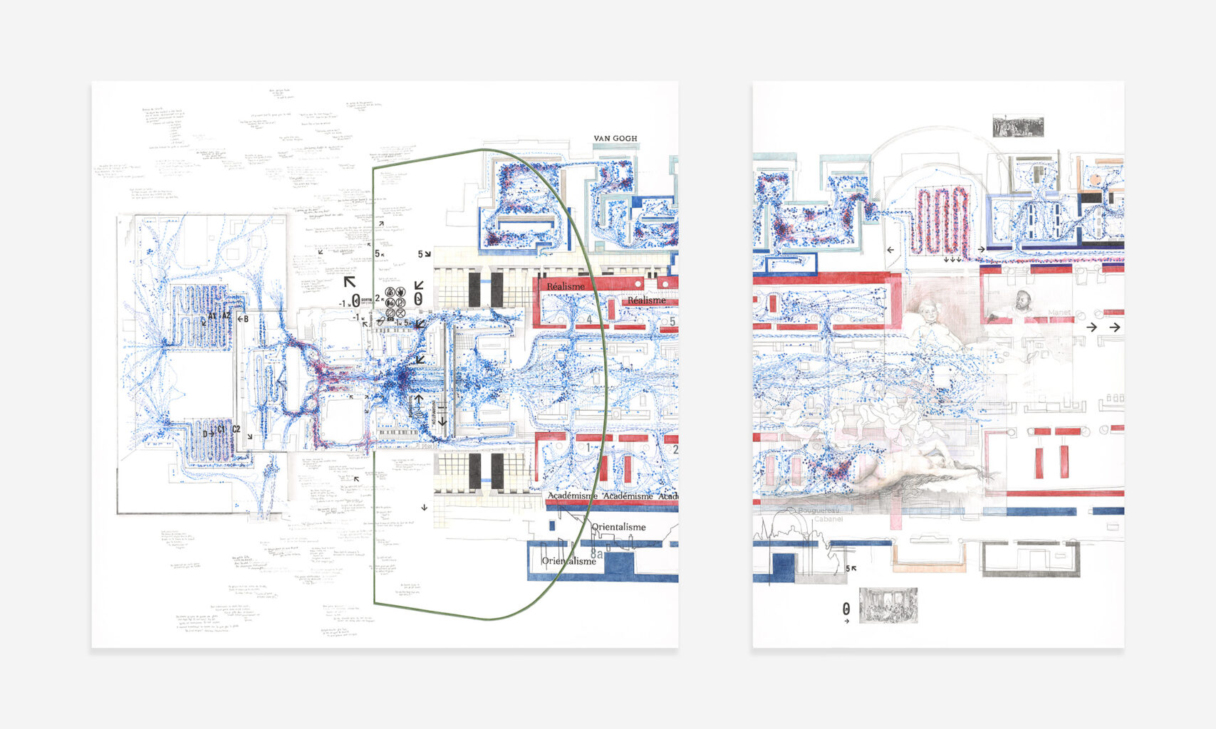Fassler, whose practice centres on empirically mapping public space, spent three months in 2023 conducting on-site research at the museum. For this period, the Musée d’Orsay became both her studio and her subject. She visited daily and used her own body as a tool to measure and map its architecture, walking the perimeters of the entrance, the nave, the galleries, the stairwells, passageways, and lifts. Each space became a hand-drawn record of where people circulate, where bodies are directed, and where they are made to wait.