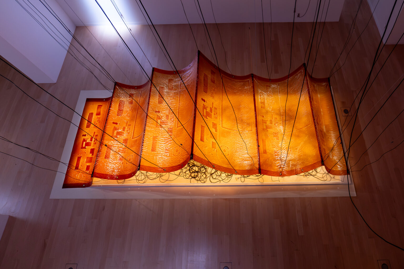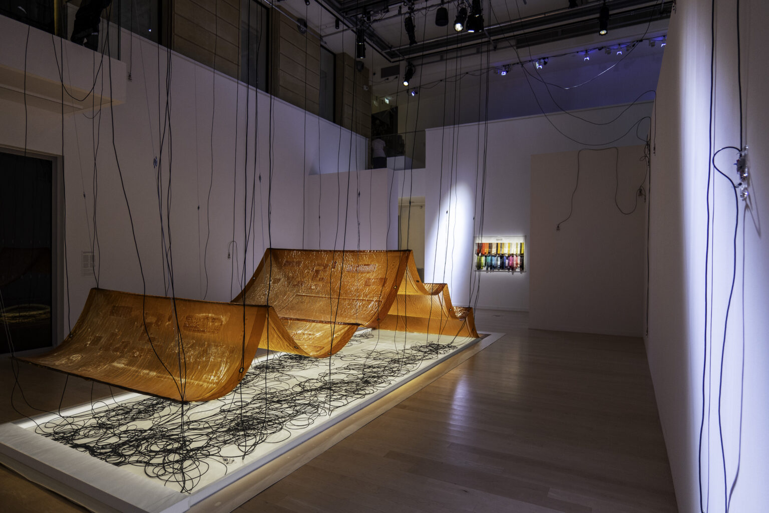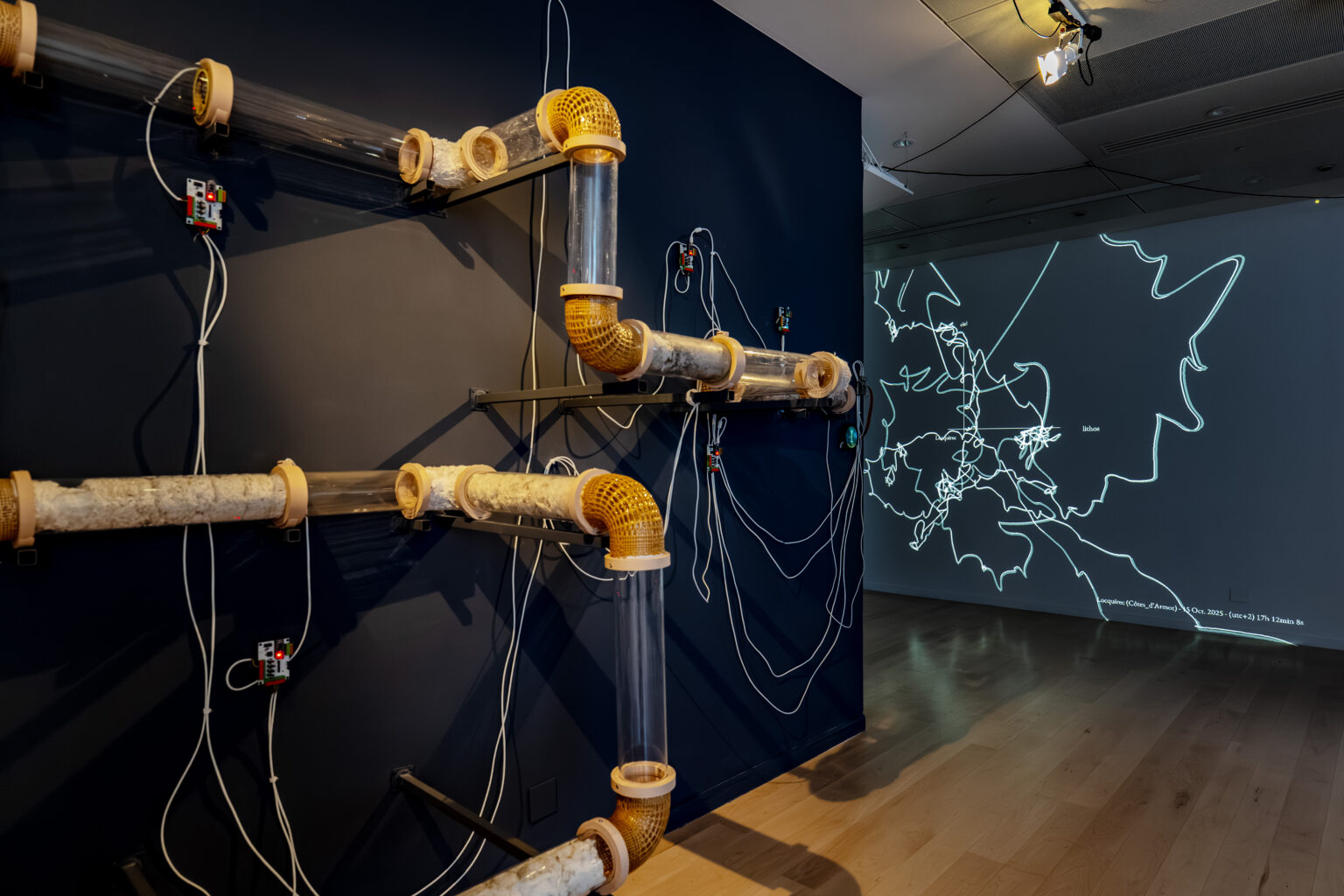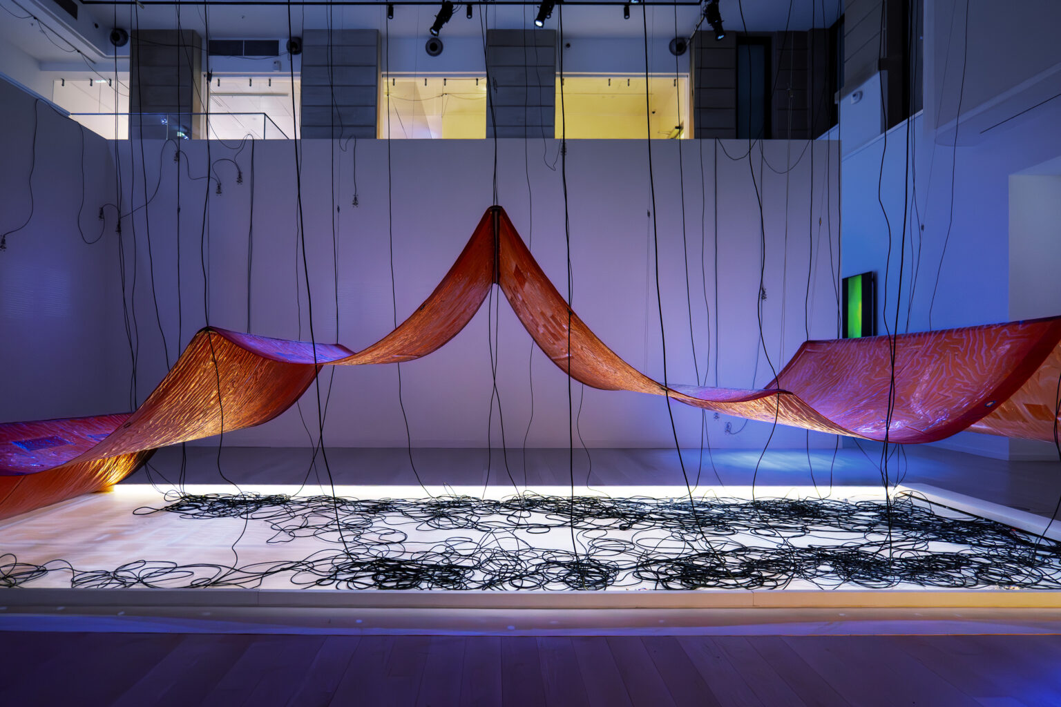 Oscillation unfolds like a constellation, organized around a central work, Fossilation, a large bioplastic membrane that illuminates the materiality of digital technologies, so often imagined in their immateriality. This suspended installation – whose tentacular cables extend throughout the space, feeding the work with the building’s residual energy – anchors the exhibition in an active quest to create environments that take shape in the porosity between practices and in the activation of connections between objects, materials, flows, researchers and the public.