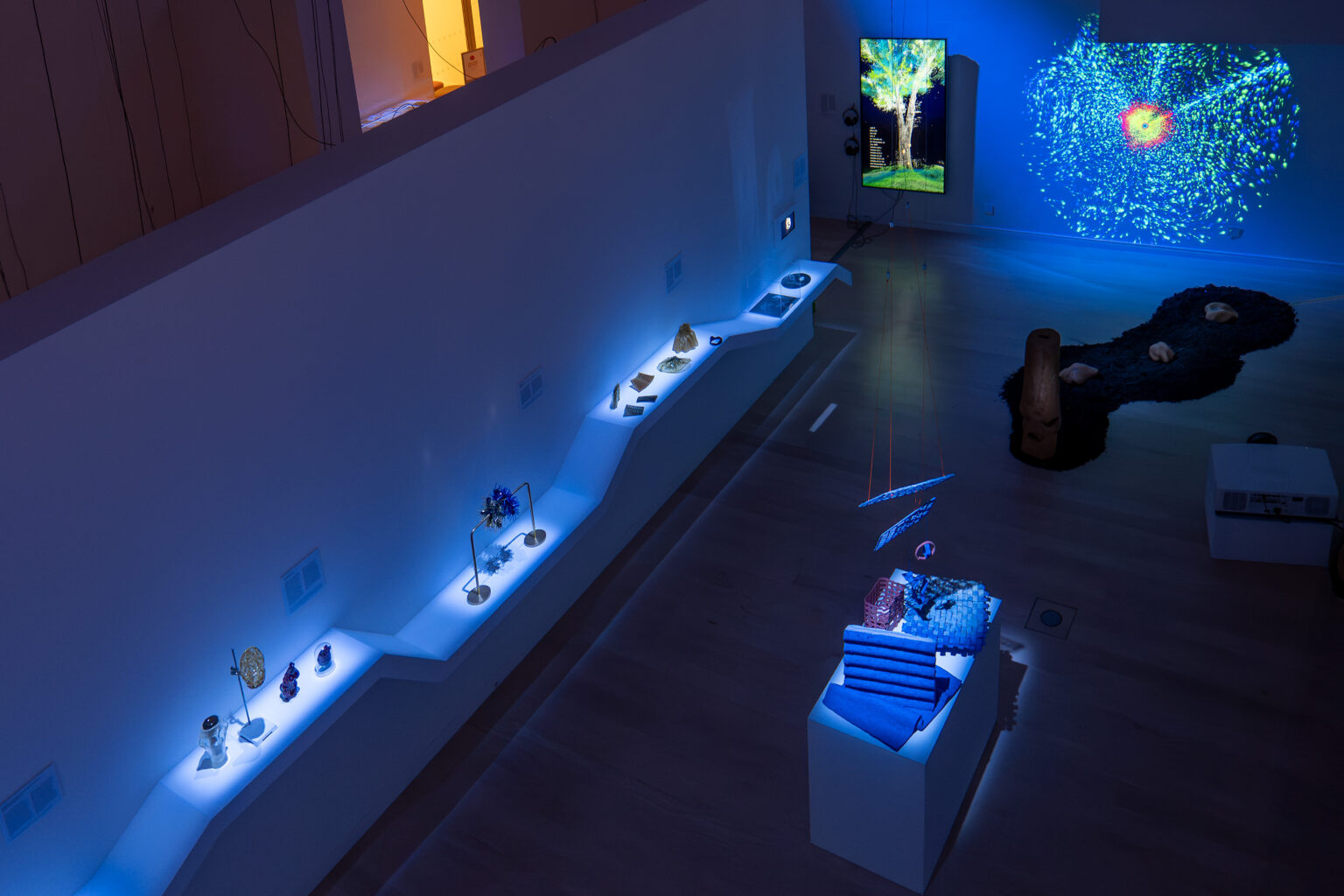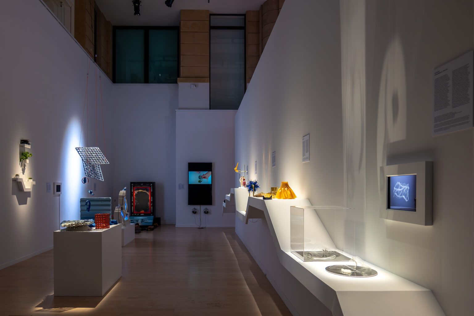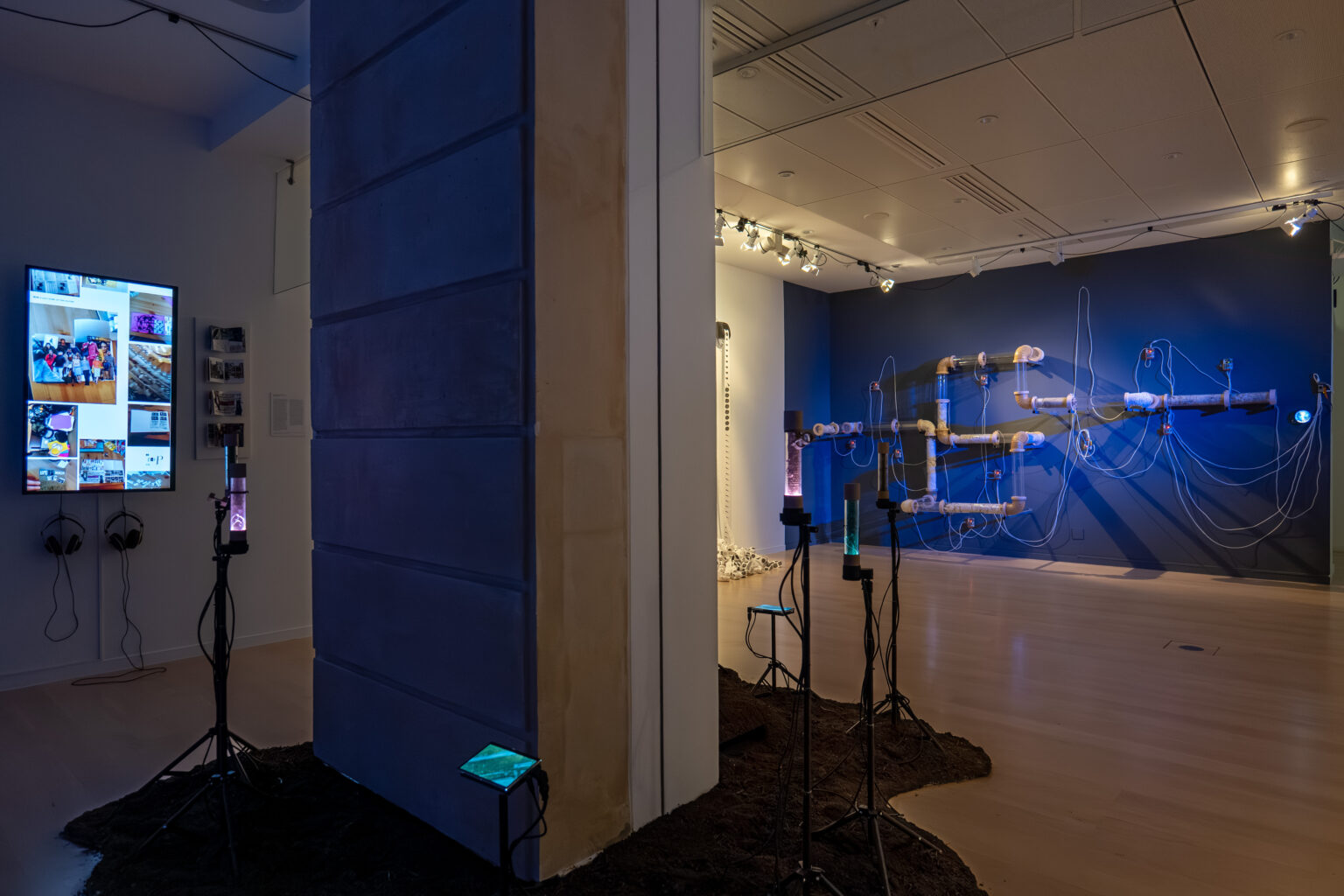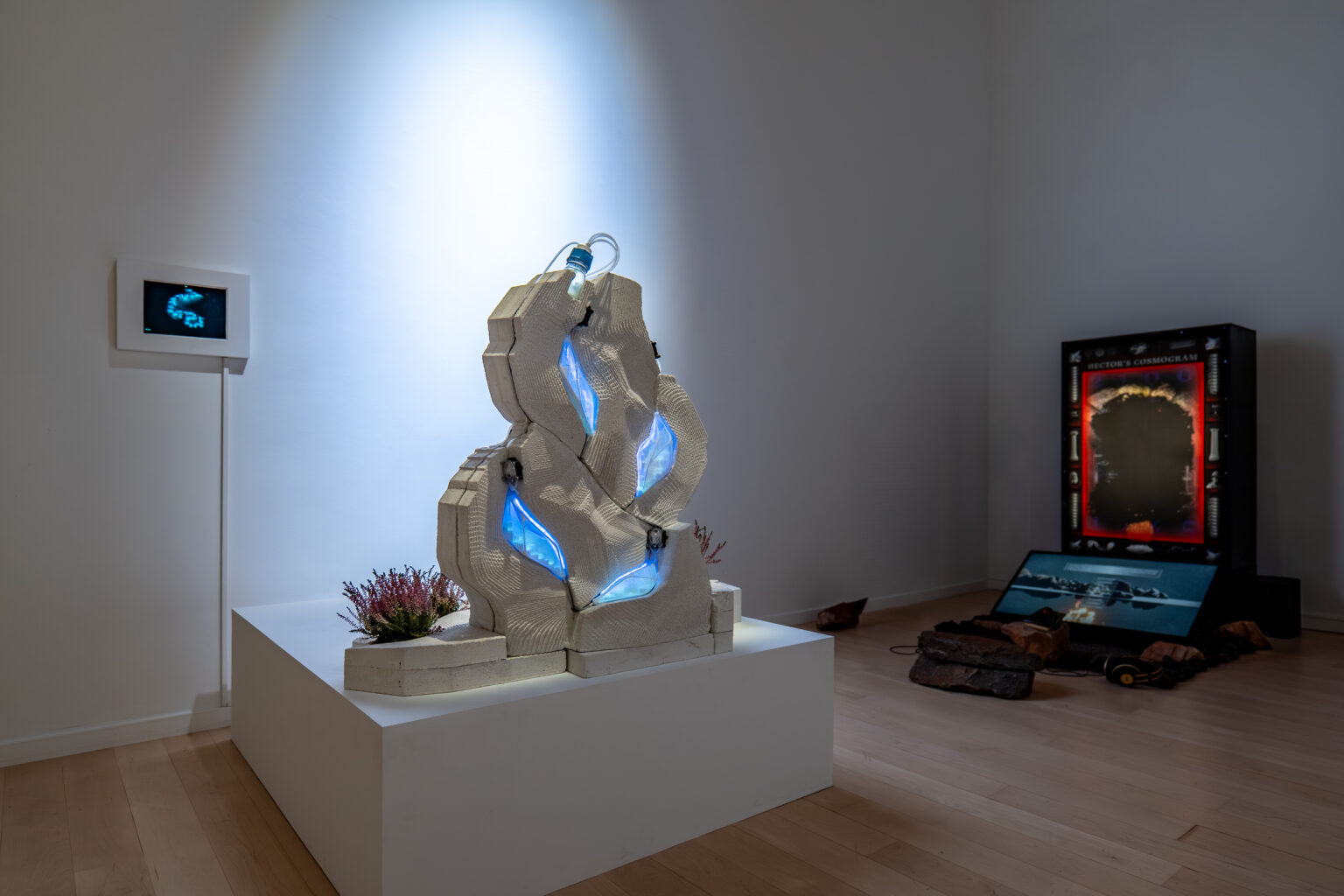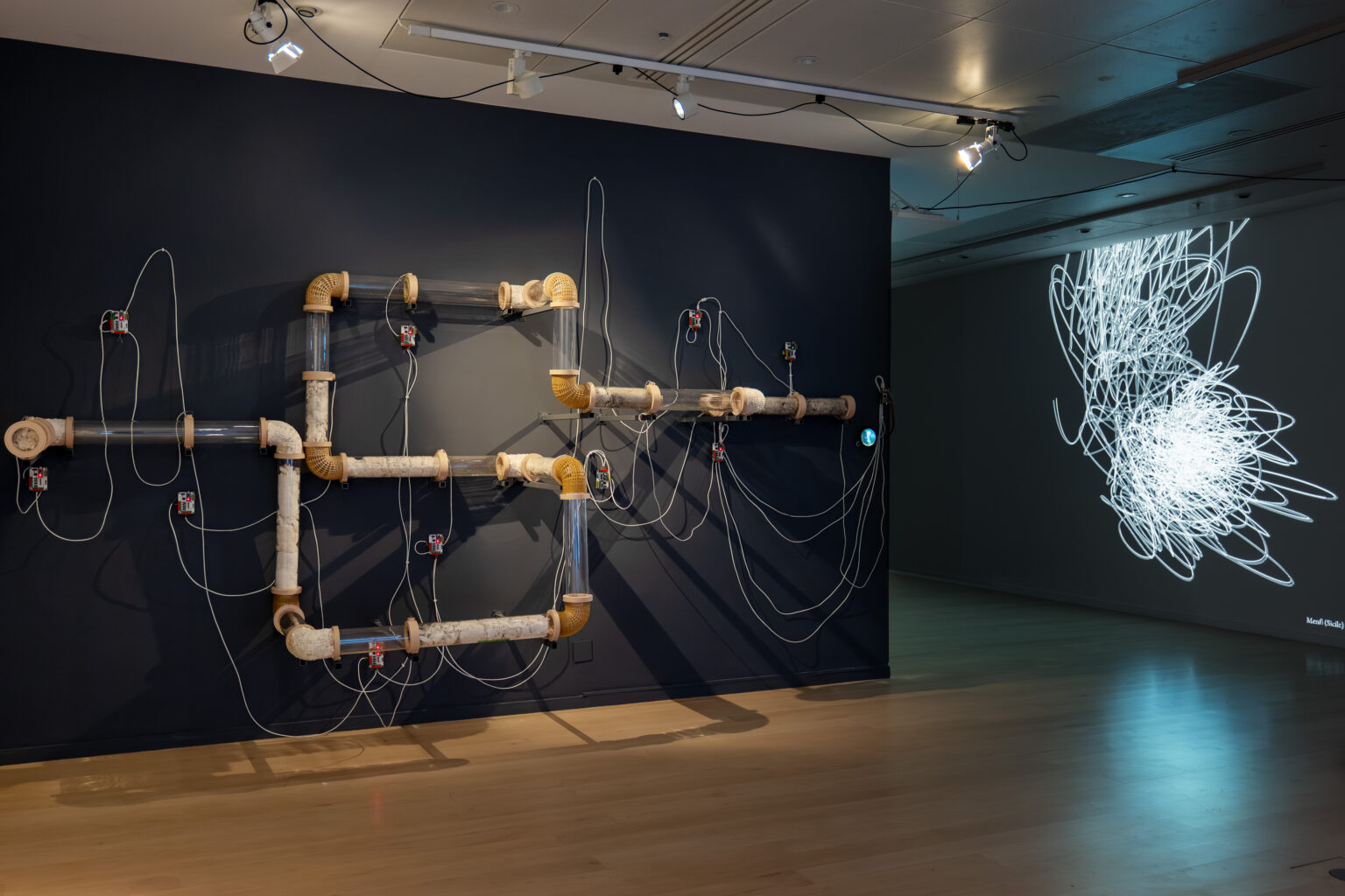 Oscillation unfolds like a constellation, organized around a central work, Fossilation, a large bioplastic membrane that illuminates the materiality of digital technologies, so often imagined in their immateriality. This suspended installation – whose tentacular cables extend throughout the space, feeding the work with the building’s residual energy – anchors the exhibition in an active quest to create environments that take shape in the porosity between practices and in the activation of connections between objects, materials, flows, researchers and the public.
